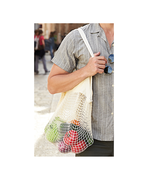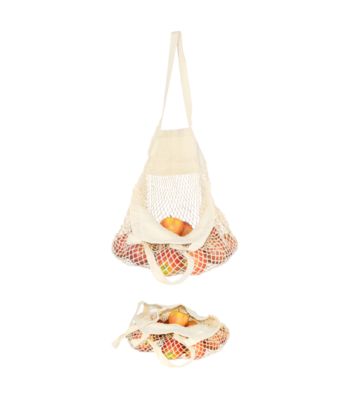 Netztasche aus 100% Baumwolle mit langen Henkel. Die Druckfläche beträgt 8x8 cm.
